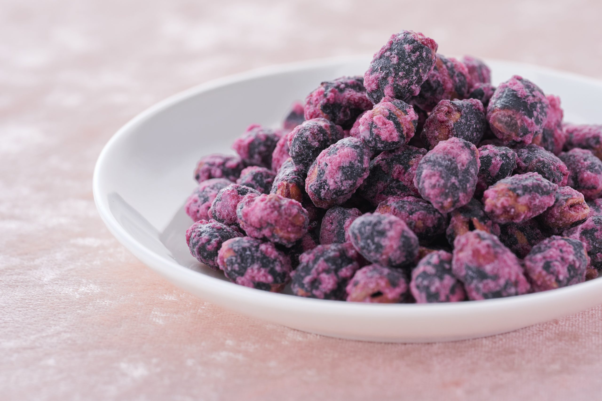 カリカリ食感の国産黒大豆に、九州産ブルーベリーのペーストを絡ませました。